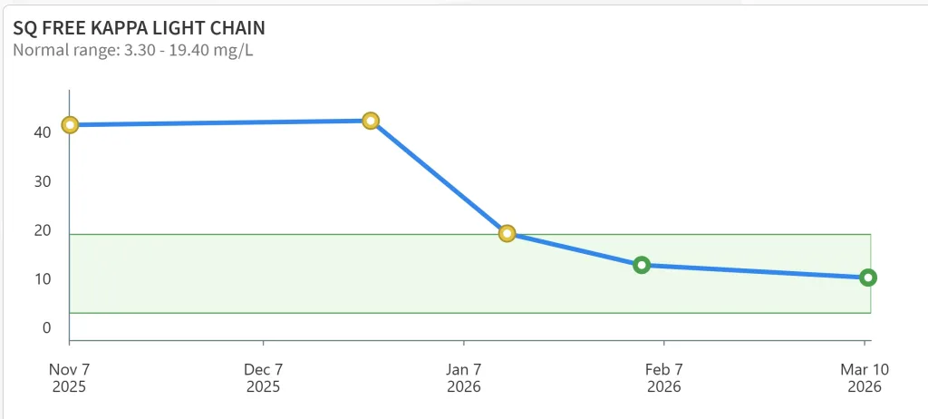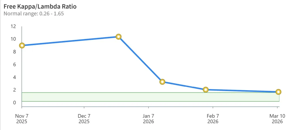 Her kappa-to-lambda ratio, once extremely abnormal, has now fallen back into the normal range. The charts show a steady decline from values around 9-10 (far above normal) down to normal by February and March. This is one of the clearest signs that the overactive plasma-cell activity is being brought under control.